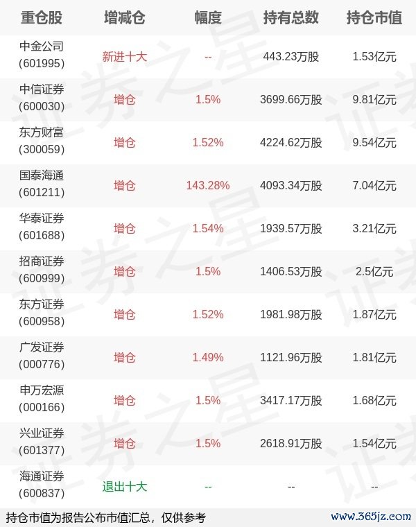 本站消息九龙证券,4月22日南方基金旗下孙伟管理的南方中证全指证券公司交易型开放式指数基金公布一季报,近1年净值增长率24.83%。与上一季度相比,该基金前十大重仓股新增中金公司;并对中信证券增仓54.85万股,为该基金第一大重仓股;海通证券等退出前十大重仓股;详细数据如下:
