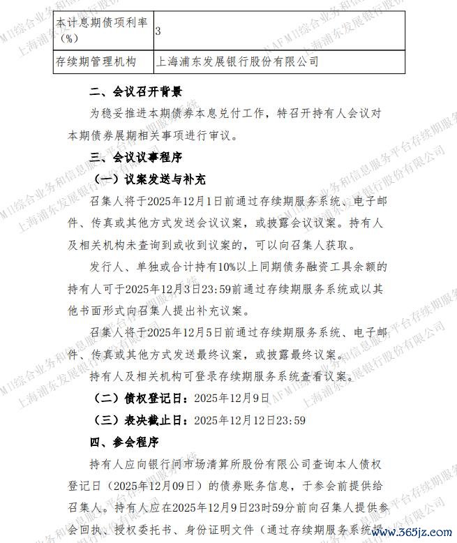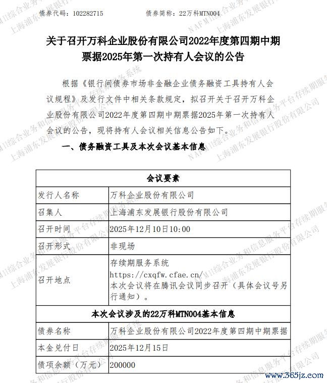上海浦东发展银行股份有限公司今日发布一份关于召开万科企业股份有限公司2022年度第四期中期票据2025年第一次持有人会议的公告。根据《银行间债券市场非金融企业债务融资工具持有人会议程》及发行文件中相关条款规定,拟召开关于万科企业股份有限公司2022年度第四期中期票据2025年第一次持有人会议,本次会议召集人为上海浦东发展银行股份有限公司。会议召开背景,为稳妥推进本期债券本息兑付工作,特召开持有人会议对本期债券展期相关事项进行审议。本次会议涉及的22万科MTN004基本信息显示,该笔债券名称为万科企业股份有限公司2022年度第四期中期票据,债项余额20亿元,本金兑付日为2025年12月15日。